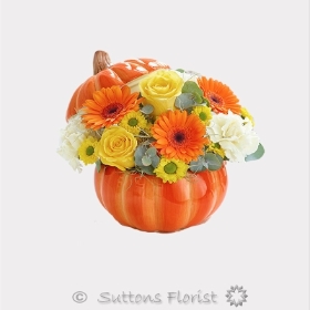 This cute arrangement of fresh flowers set in its very own ceramic pumpkin makes an adorable gift that’s sure to prompt a smile. A hand-picked array of fresh blooms in bright, sunny shades of orange and yellow give this display a real lift. A charming choice for autumn.