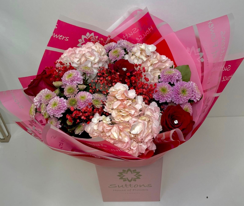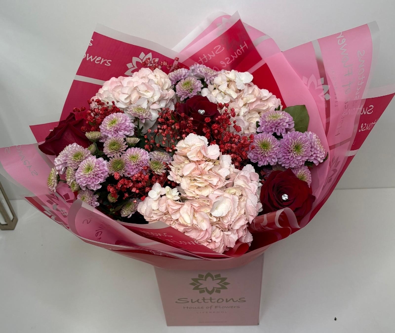 "Pink hydrangeas, crimson roses, and hand-picked premium blooms – what’s not to love about this Valentine’s bouquet?"