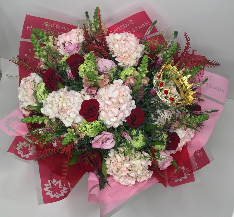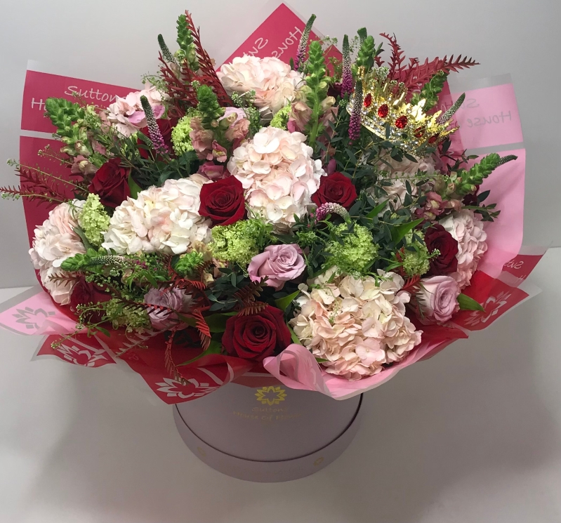 Obsessions, is by far our largest bouquet this valentines. With a verity of high end blooms including red and purple rose and completed with a stunning  crown in our luxe hatbox