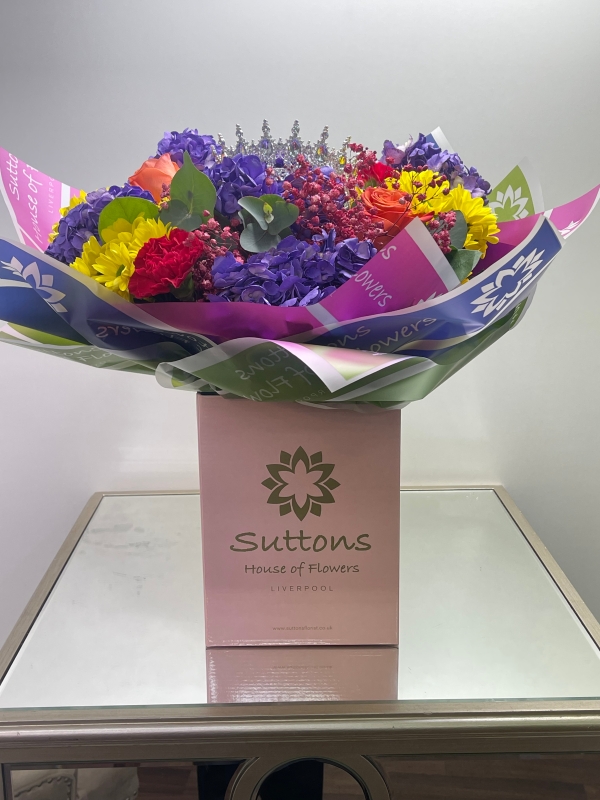 The bouquet's contents may differ from the image shown, as each is custom-made by the florist using a selection of seasonal blooms available that day. Any substitutions will be of equal or higher value.
