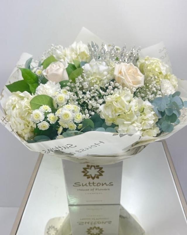 This bespoke hand tied consists of the finest flowers including stunning white  hydrangeas, white carnations, white  chrysanthemums and Large Headed white rose nestled between luscious green  foliage.
