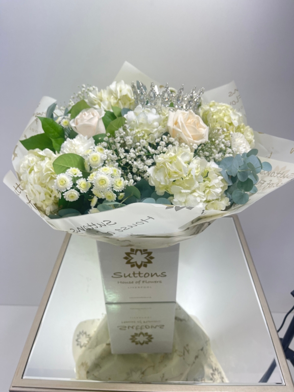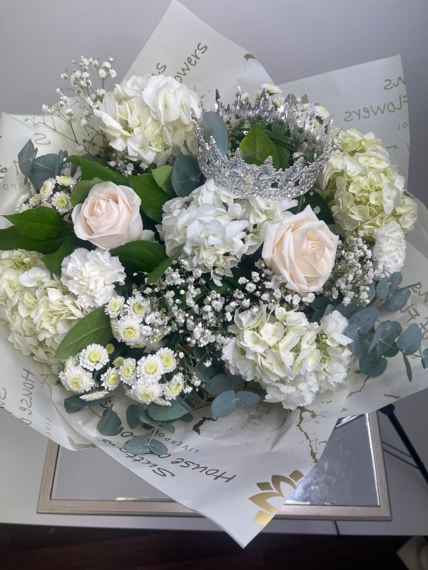 This bespoke hand tied consists of the finest flowers including stunning white  hydrangeas, white carnations, white  chrysanthemums and Large Headed white rose nestled between luscious green  foliage.