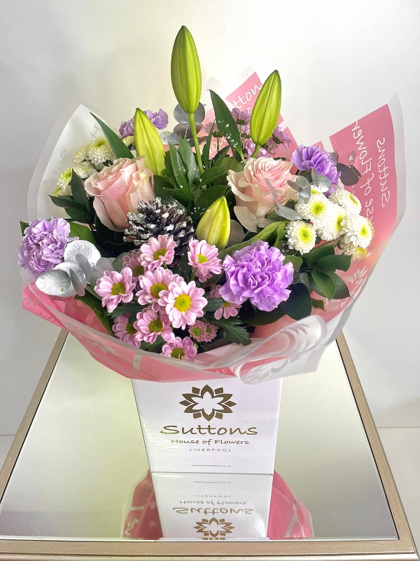 Our Winter Frost Bouquet features delicate hues of pink, purple, and white, accented with frosted pinecones for a touch of seasonal charm. A luxurious bouquet perfect for embracing the beauty of the brrr season.