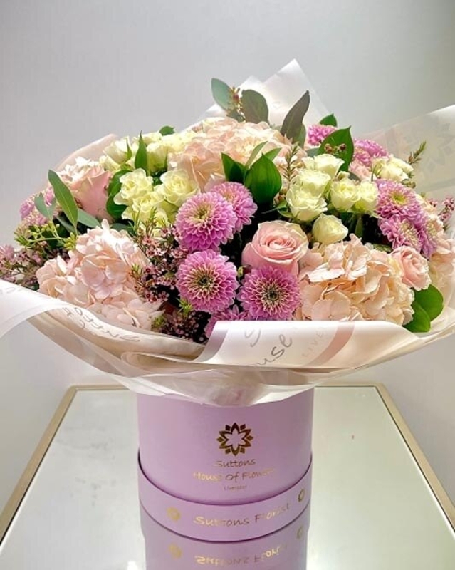 This elegant hatbox arrangement features a lush blend of soft pink hydrangeas, delicate pastel roses, and vibrant lilac chrysanthemums. Presented in a signature lavender box, it’s a sophisticated choice for birthdays, anniversaries, or simply to brighten someone’s day.