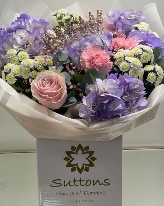This elegant "Suttons House of Flowers" bouquet features a stunning arrangement of soft purple hydrangeas, delicate pink roses, and white spray chrysanthemums accented with fresh eucalyptus. Presented in a signature gift box and topped with an optional decorative crown.
