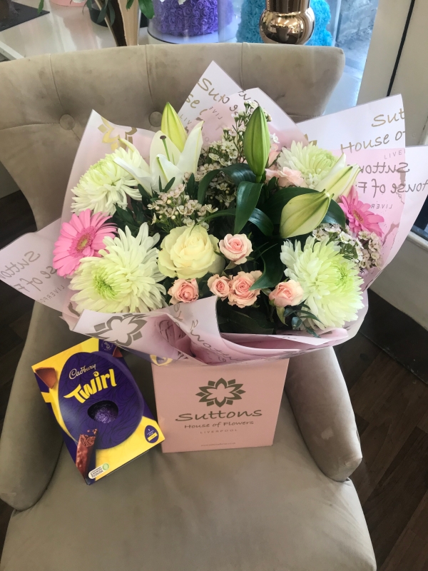 A hand-tied bouquet hand crafted by one of our florists, including lily, large headed roses and a selection of seasonal flowers in pink and white this bouquet's contents may differ from the image shown Any substitutions will be of equal or higher value.            Easter egg may vary from the one advertised